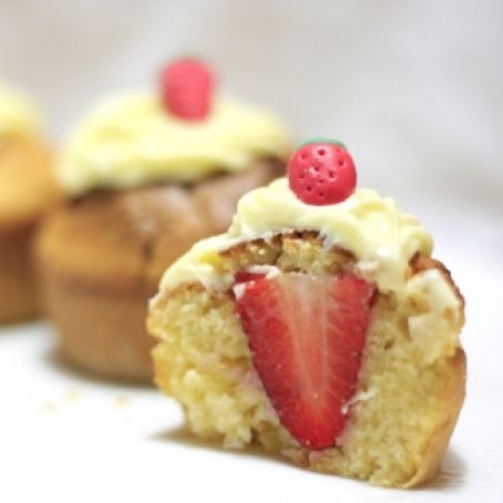 Tritate finemente il cioccolato bianco e ponetelo in una ciotola con la farina setacciata, il lievito, e lo zucchero. Sciogliete a bagnomaria il burro e dopo averlo lasciato intiepidire unitevi le uova e il latte e mescolate accuratamente. Unire al composto di farina preparato in precedenza e amalgamare. Riempite i vostri pirottini, se necessario precedentemente imburrati e infarinati e fate cuocere a 180° per 20-25 minuti. Una volta cotti i cupcake lasciateli raffreddare per bene, con un coltello ricavate un cerchio dalla parte superiore centrale del cupcake e mettetelo da parte, con un cucchiaino scavate delicatamente il centro del cupcake in modo da potervi adagiare la fragola intera. Chiudete il cupcake con il “cappellino” ricavato in precedenza aiutandovi un un pò di panna, crema o frosting e decorate a piacere. Io ho usato del fudge al cioccolato bianco ottenuto lavorando 150g di burro con 160 g di zucchero a velo e unendo in fine 120 g di cioccolato bianco sciolto a bagnomaria, voi potrete anche decoralo con frosting, crema pasticcera o semplicemente con la panna.