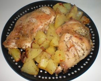 Aggiungere le patate nella teglia insieme al pollo, e versarci sopra l’olio aromatico rimasto.
