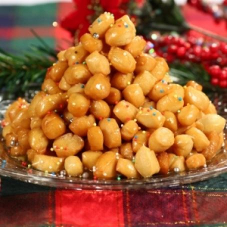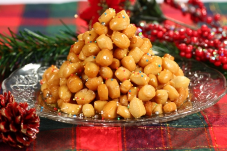 Quando il miele si sarà solidificato, togliete delicatamente il barattolo dal centro del piatto e servite gli struffoli.