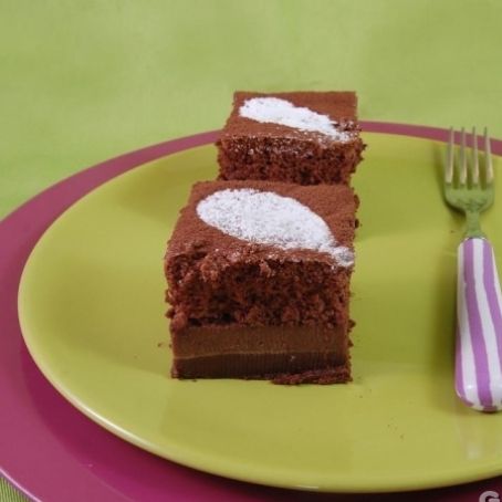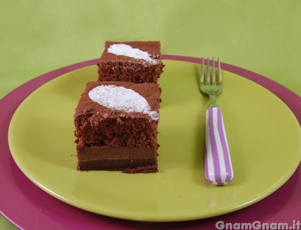 Tagliate la torta magica al cacao a cubetti e servite spolverando con cacao e zucchero a velo.