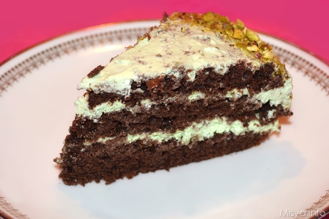 Alternate uno strato di torta ad uno di farcia. Ricoprire tutti i bordi e la superficie della torta con la granella di pistacchi. Mettete la torta al pistacchio in frigo per almeno un’ora prima di tagliare a fette e servire.
