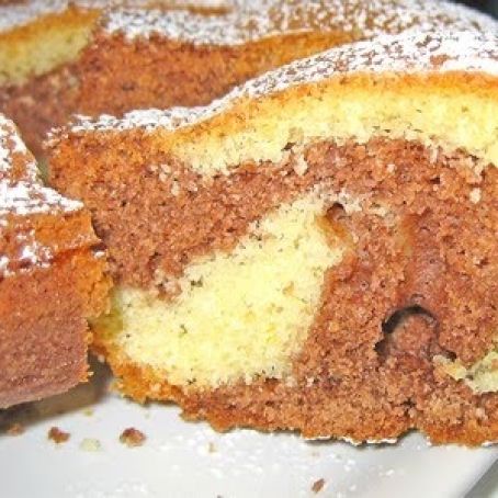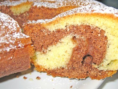 Imburrate ed infarinate uno stampo per ciambella del diametro di 26 cm ed adagiatevi l’impasto chiaro, diviso in tre parti; fate la stessa cosa con quello scuro andando a colmare i vuoti rimanenti tra l’impasto chiaro. Per ottenere l’effetto marmorizzato, fate passare a spirale una forchetta dall’alto verso il basso attraverso i due colori dell’impasto. Infornate la ciambella per circa 40-45 minuti a 180°. Controllate la cottura verificando con uno stuzzicadenti : se pungendo in profondita’ la ciambella non rimarranno residui sullo stuzzicadenti, il dolce sara’ cotto. Sformate la ciambella, posizionatela su di un piatto e cospargetela a piacimento di zucchero al velo.