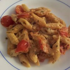 Mescolate in una tazza adatta al forno a microonde 2 uova con 2 cucchiai di latte, sale e pepe. Aggiungete del basilico fresco tritato, dei pomodori ciliegini tagliati a metà e 2 cucchiai di formaggio di capra o di mozzarella a dadini. Completate con un cucchiaio di parmigiano grattugiato e mettete in microonde per 2-3 minuti.