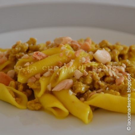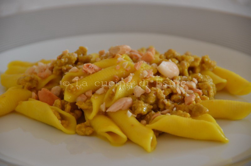 Grattugiate finemente la scorza dell’arancia. Tostate le mandorle e una volta che saranno ben raffreddate frullatele grossolanamente (basta usare il mixer a scatti). Tritate la cipolla e fatela appassire in un tegame antiaderente con un filo di olio evo. Rosolatevi la carne a fuoco medio finché risulterà ben sgranata. Cospargete con un velo leggero di farina e mescolate, bagnate con una spruzzata di vino e fate evaporare. Stemperate lo zafferano in un mestolo di brodo caldo, versatelo sulla carne, coprite e cuocete circa 15 min a fuoco basso, aggiungendo altro brodo se servisse affinché il ragù resti morbido. Aggiustate di sale. Lessate la pasta e quando sarà pronta scolatela bene e versatela nel tegame del ragù. Aggiungete la scorza di arancia grattugiata, una spolverata di parmigiano e mescolate bene. Impiattate e spolverate con le mandorle tostate.