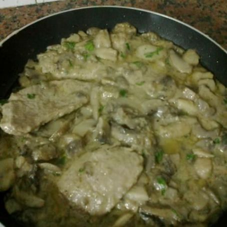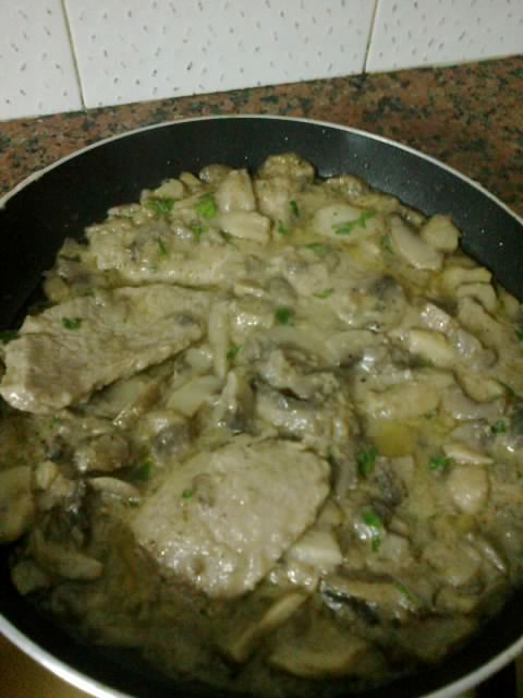 Quando la carne sarà pronta aggiungervi i funghi, salare, pepare e sfumare con il vino. Continuare la cottura fino a quando la carne sarà ben cotta e si sarà formata una salsina cremosa.