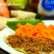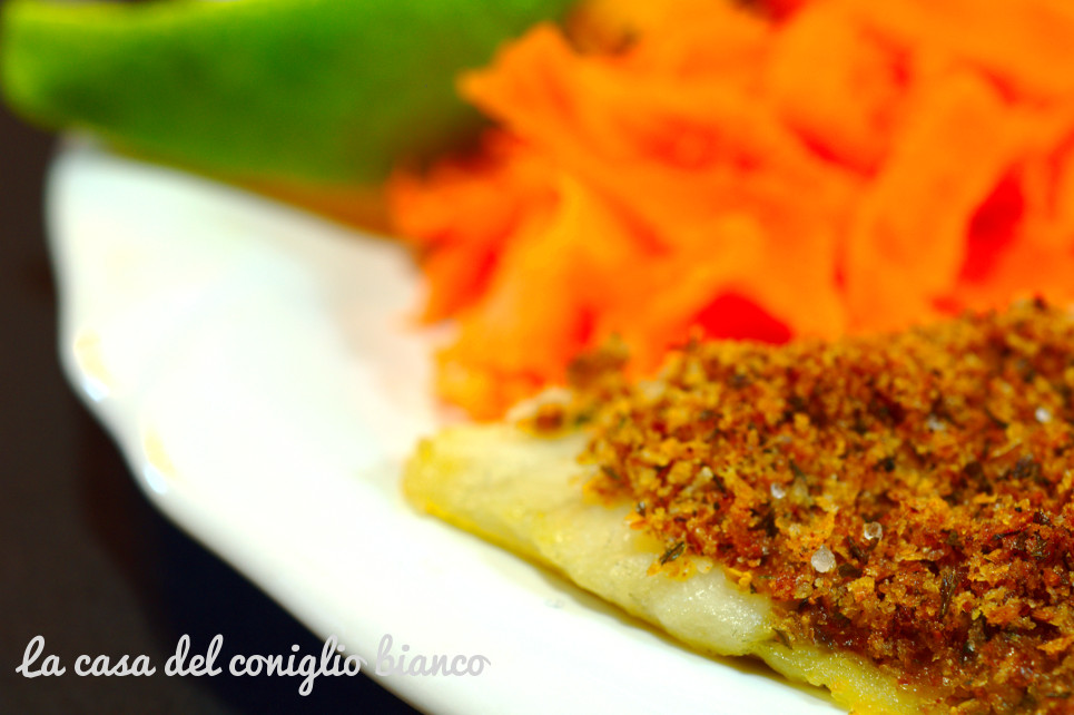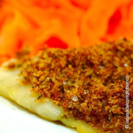 Grattugiare 50 gr di pane integrale e metterlo in una tazza, quindi mescolarlo con le spezie dosando in base ai propri gusti. Unire 3 cucchiaini di olio al composto e cercare di amalgamarlo il più possibile. A questo punto stendere il composto sui filetti fino a esaurimento. Pressare bene con le mani il pangrattato aromatizzato sul pesce per far aderire bene.