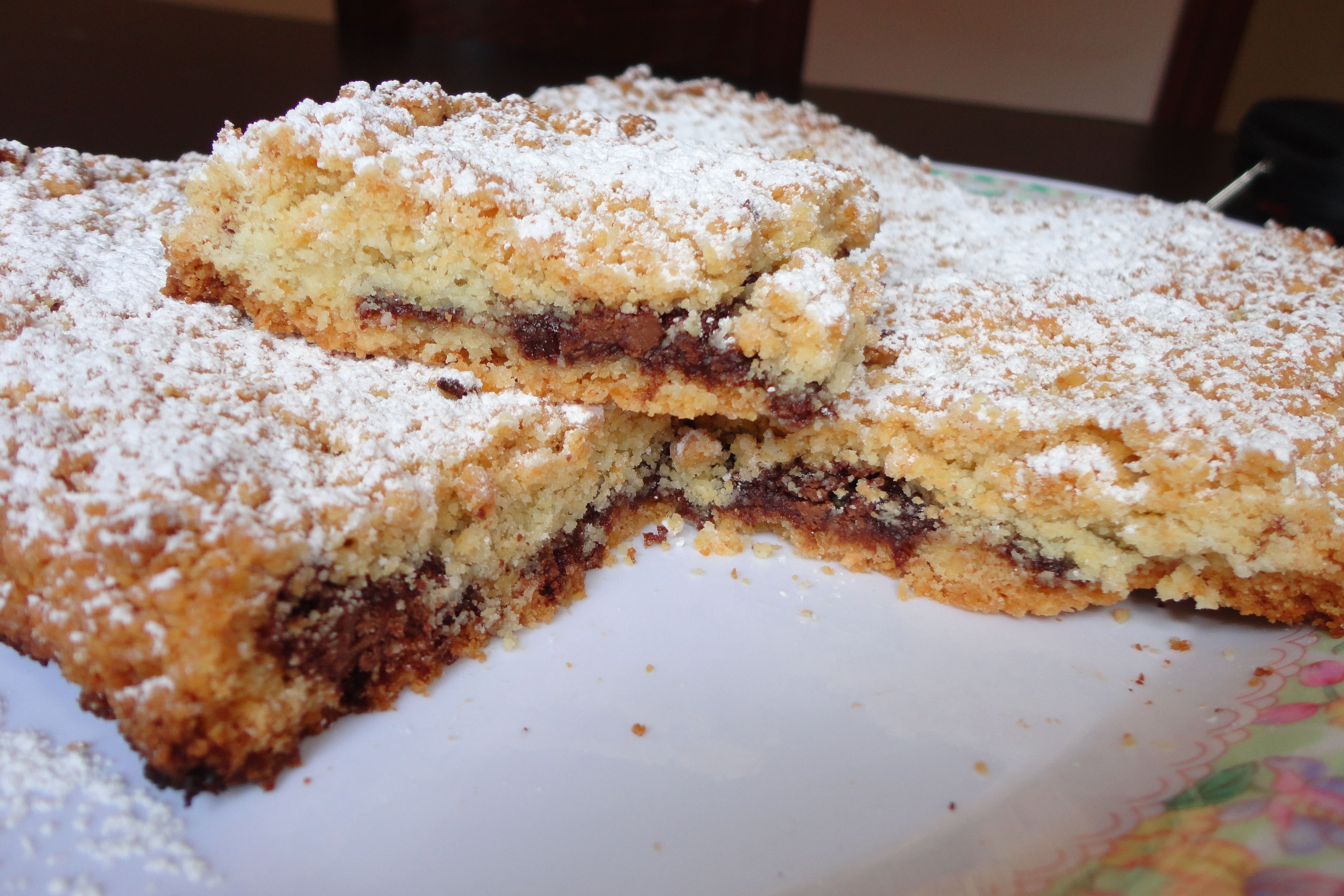 Disporre metà impasto sbriciolato in una terrina imburrata e infarinata, coprire con uno strato di crema alle nocciole e inine con il restante impasto sbriciolato.