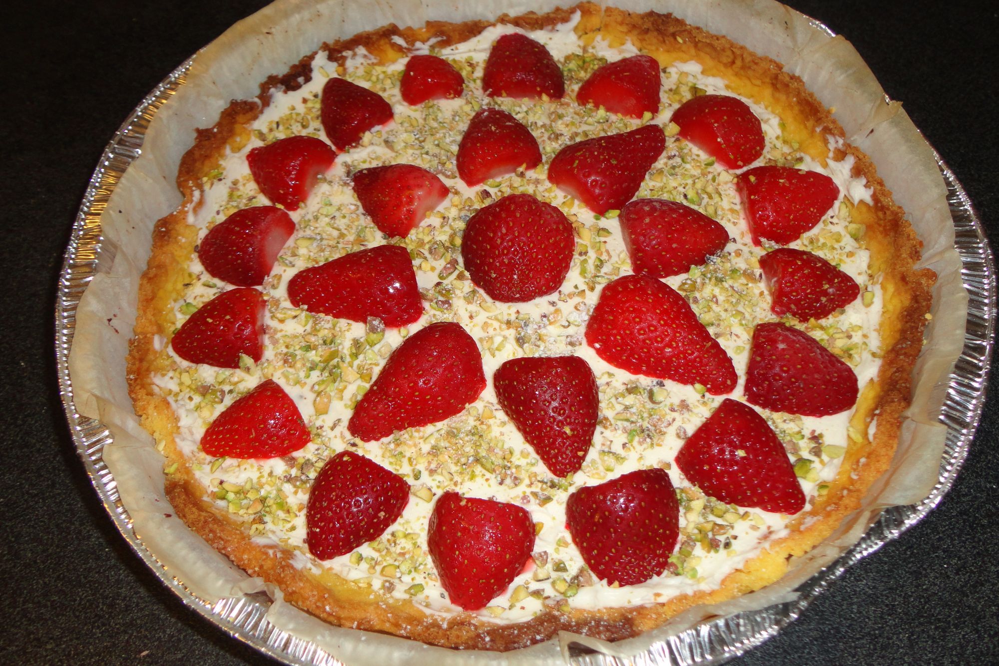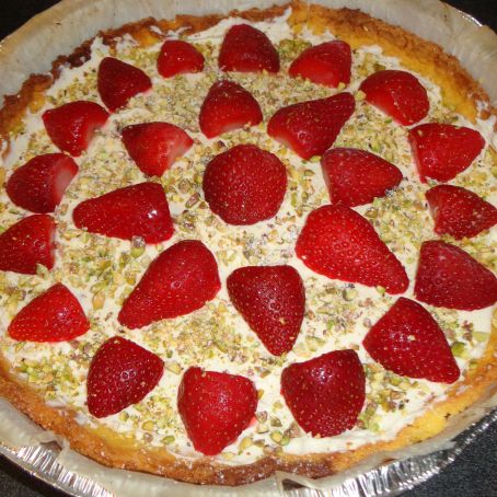 Una volta che la frolla è fredda farcire con il mascarpone montato con lo zucchero a velo e la vanillina. Guarnire con le fragole e la granella di pistacchi.