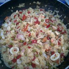 Unire quindi il riso al pollo e ai peperoni e terminare la cottura.