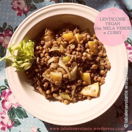 Ho messo ammollo le lenticchie in acqua finchè non si sono ammorbidite (dipende dal tipo di legume che acquistate, in genere sulla confezione è indicato il tempo necessario), poi le ho messe a bollire in acqua per 20 minuti e scolate. In una pentola ho messo a rosolare in olio extravergine di oliva la cipolla dorata tagliata finemente, il gambo di sedano a pezzettini e la mela verde fatte a dadini, tenendo la buccia (lavatele bene prima di usarle!). La mela ci impiega poco a cuocere, perciò attenzione.. Prima che si spappoli, quindi quando ancora i dadini sono ben formati e croccanti, buttate dentro le lenticchie e mescolate. Fate andare a fuoco basso, magari aggiungendo un po’ di acqua, per circa 10 minuti.