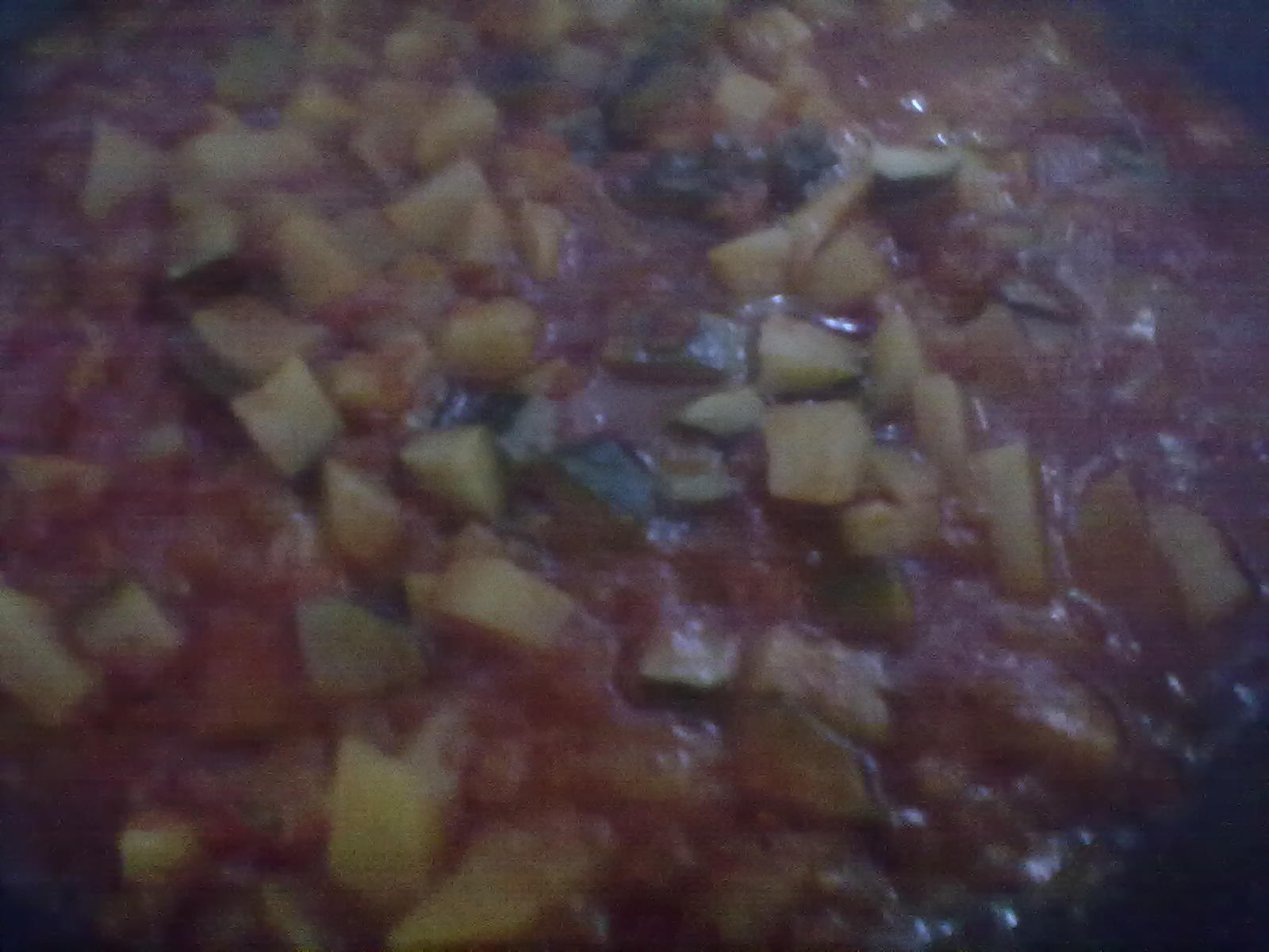 Dopo aggiungere la polpa di pomodoro le patate e le zucchine tagliate a quadrettini e l'acqua fino a coprire il composto.
