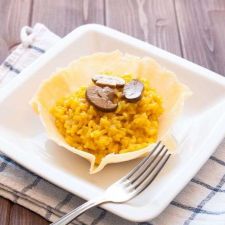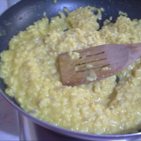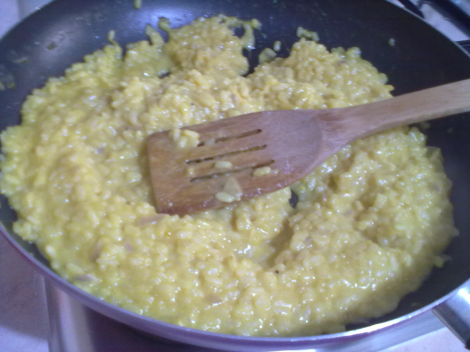 A meta' cottura sciogliete lo zafferano in poco brodo e versatelo nel riso facendo amalgamare bene.