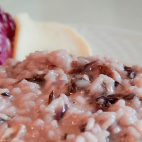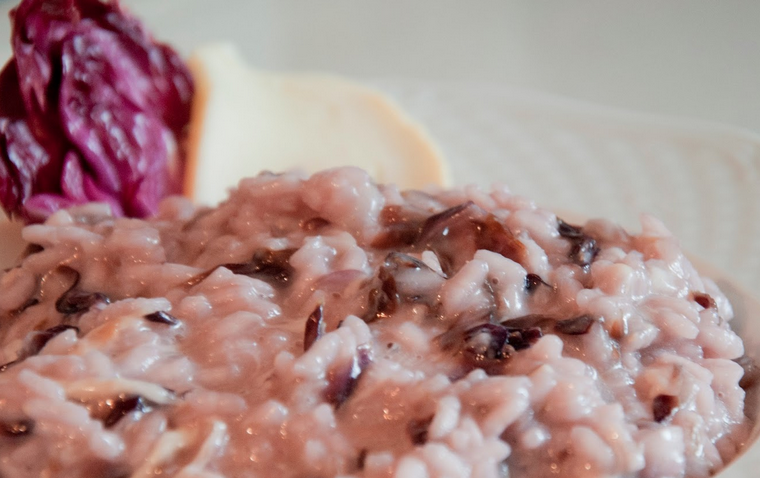 In una capiente pentola mettere qualche tocchetto di burro a scioglere nel quale far soffriggere la cipolla tagliata a pezzetti. Aggiungere il riso e tostarlo leggermente (solitamente fino a quando i chicchi sembrano trasparenti). Bagnare il riso con il vino e farlo evaporare bene, a questo punto aggiungere il brodo caldo poco alla volta. A metà cottura aggiungere il radicchio lavato e tagliato a listarelle. Aggiustare di sale e pepe. Terminata la cottura togliere dal fuoco e mantecare con qualche fiocco di burro, il grana grattuggiato e la scamorza tagliata a dadini. Girare bene