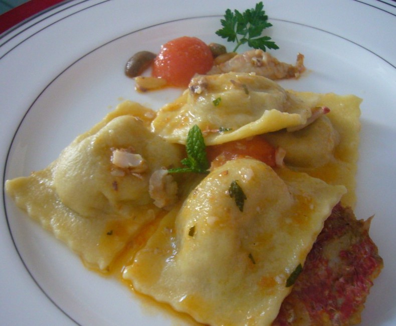 Nel frattempo preparate il condimento utilizzando i filetti di triglia messi da parte. Insaporite uno spicchio d’aglio in padella con olio, pinoli, capperi e olive verdi a pezzetti. Aggiungete i pomodorini tagliati a metà e infine le triglie. Cuocete per qualche minuto. Mettete da parte un bicchiere di brodo di cottura per amalgamare il condimento. Salate, pepate e finire con del prezzemolo tritato. Saltate i ravioli in padella e servite.