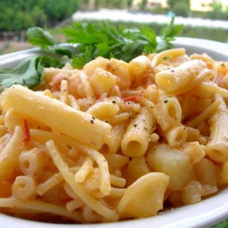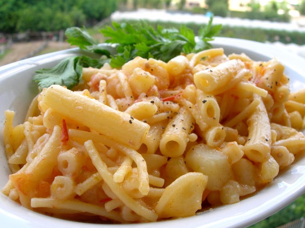 Impiattate la pasta e patate portando in tavola del formaggio grattugiato in modo che i vostri commensali possano servirsi a piacere.