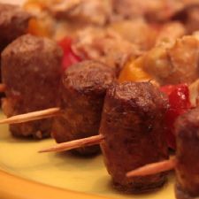 Prendere degli stecchini lunghi fare dei dadini alternati di mortadella, emmenthal, lombo di maiale precedentemente cotto poi impanare con uova,forma e pane grattugiato , poi friggere in olio di semi