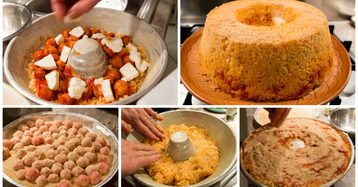 Ungete una teglia, rivestitela di carta forno e ungete anche la carta forno. Ricopritela col pangrattato e ricopritene bordi e fondo col risotto, farcite col ragù, le polpettine e l'intingolo e chiudete col restante risotto.