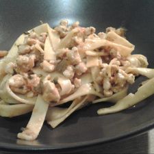 Preparate quindi la pasta: disponete la farina a fontana sulla spianatoia, sgusciate le uova e versatele al centro, sbattetele con la forchetta e poi impastate fino a ottenere un composto liscio e omogeneo. Stendete con il matterello una sfoglia sottile sulla spianatoia infarinata, quindi ricavate tante tagliatelle larghe 5 mm.