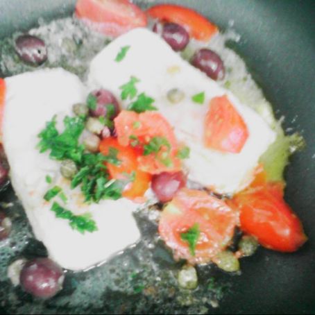 In una padella ntiaderente adagiare i filetti di merluzzo con un filo d'olio abbondante,lavare i pomodorini tagliarli a meta' e metterli sopra, aggiungere le olive nere possibilmente denocciolate, i capperi risciaquati per togliere il sale, il prezzemolo e un pizzico di sale, e cuocere a fiamma bassa per 15,20 minuti,e servire
