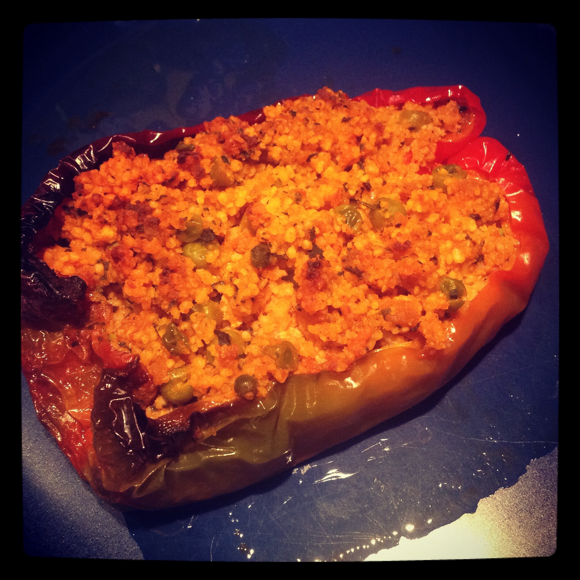 Irrorare l'interno dei peperoni con un po' di olio d'oliva e riempirli con il composto. Sistemarli in una pirofila con 2 cucchiai di olio. Cuocere per 30-40 minuti.