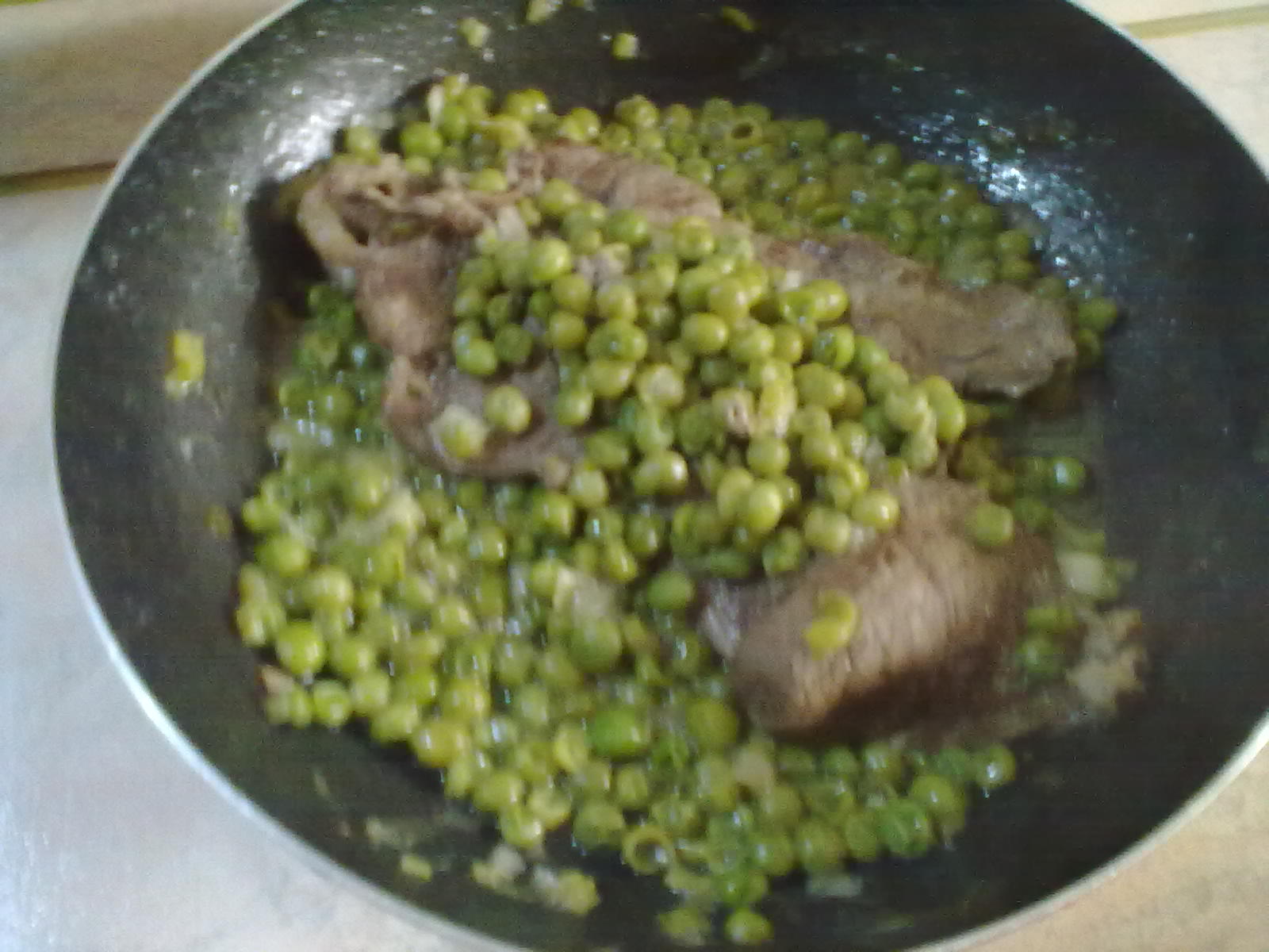 Dopodiche' aggiungere i piselli e acqua per coprirli , cuocerli a fiamma bassa aggiungendo un dado vegetale.