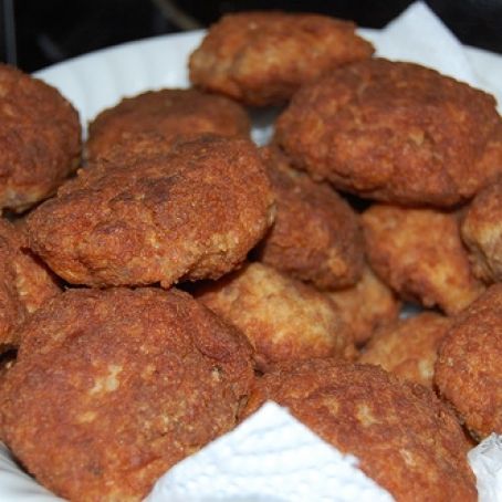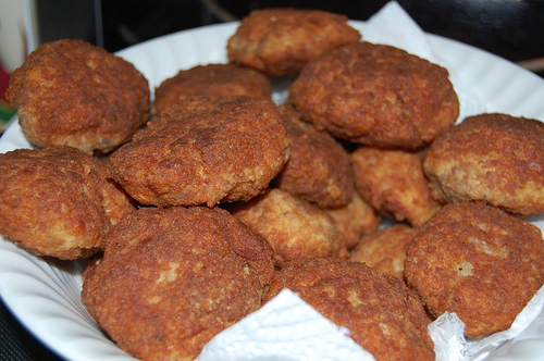 Dare una forma alle polpette belle strette e poi farle passare nel pane grattugiato per fargli fare la crosta, e farle friggere.