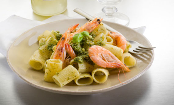Quando la pasta sarà cotta, scolarla sotto l’acqua fredda e, quando si sarà raffreddata, metterla in una ciotola capiente,aggiungere il pesto e mescolare bene. Servire quindi nei piatti e aggiungere nei singoli piatti i gamberi, anche se saranno ancora leggermente tiepidi.