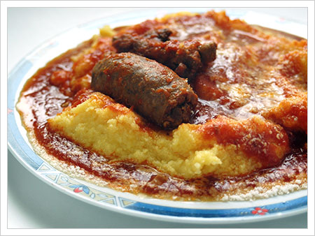 Impiattare con un mestolo di legno la polenta ed aggiungere il sugo con la carne e spolverizzare con il parmigiano.