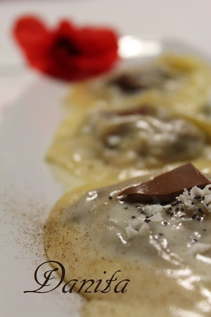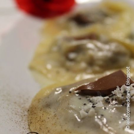 Stendere la pasta sottile, io l'ho fatta allo spessore di 8, mettere un cucchiaino di condimento, coprire con un altra pasta stesa sottile, levare tutta l'aria e tagliare con un cerchio.