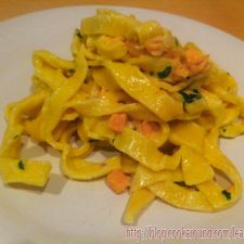 Mettete ora in una grande padella uno spicchio d'aglio tagliato a metà e 8 cucchiai d'olio. Fate soffriggere. Eliminate quindi l'aglio, unite l'acqua delle vongole, la zucchina tagliata a fiammifero e i gamberi. Fate restringere a fuoco moderato e nel frattempo lessate le fettuccine.
