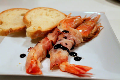 Sgusciare i gamberoni lasciando intatta coda e testa, togliere il filo nero con uno stuzzichino, aggiustare di sale (non troppo), arrotolare i gamberoni con la pancetta e predisporre su una teglia da forno coperta con carta.