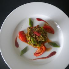 Prendere un filetto di spatola, adagiare sopra la fetta di melanzana fritta, spalmare con un pò di pesto e posizionare i grani di melagrana.