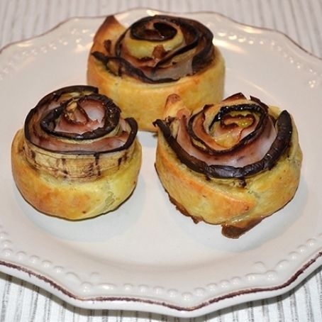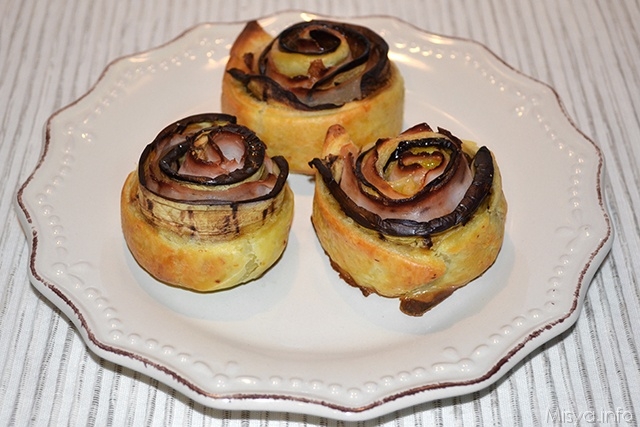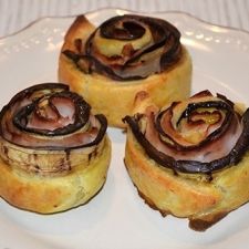 Salare, pepare e poi ricoprire con un po' di prosciutto cotto e del parmigiano grattugiato. Richiudere la sfoglia a metà, quindi arrotolarla su se stessa fino a formare una rosa. Poggiate le rose di melanzane su una teglia rivestita di carta forno, poi cospargetele con un filo d’olio ed infornate in forno già caldo a 200°.