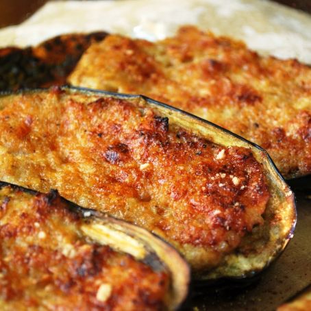 Farcire ora le melanzane con il ripieno ottenuto con l’aiuto di un cucchiaio. Versare sul fondo della pirofila una tazzina d’acqua, spolverizzate con il pangrattato quindi infornare le melanzane ripiene a 180° e cuocere per circa 40 minuti.