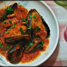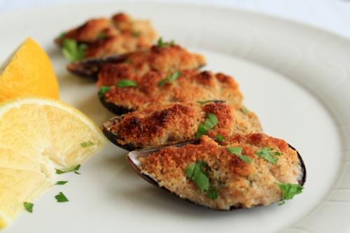 Eliminare le mezze valve vuote. Staccare i molluschi e deponerli al centro di ogni conchiglia. Disporre le cozze in una pirofila. Distribuire il composto di pangrattato. Irrorare con un filo d'olio e gratinate, nel forno a 200°C, per 10 minuti.