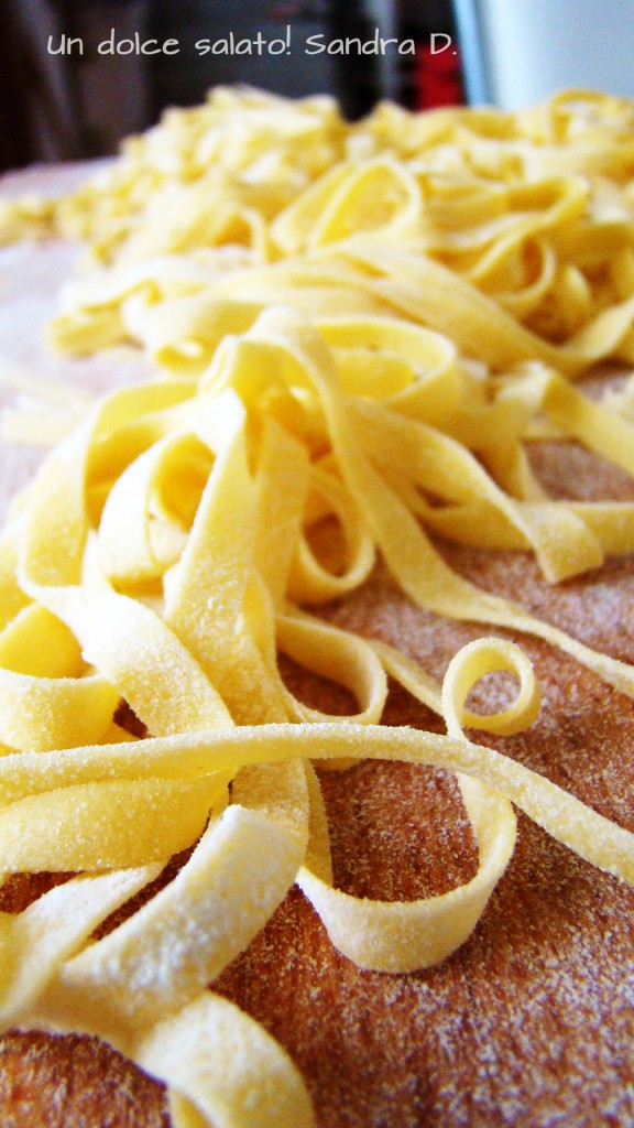Una volta ottenuto il taglio di pasta preferito (io in questo caso ho realizzato delle tagliatelle) lo lasciamo riposare ancora una decina di minuti e poi possiamo passare alla cottura in acqua bollente salata per non più di tre minuti, e a cui dovremmo aggiungere un filo d’olio per evitare che la pasta si attacchi.