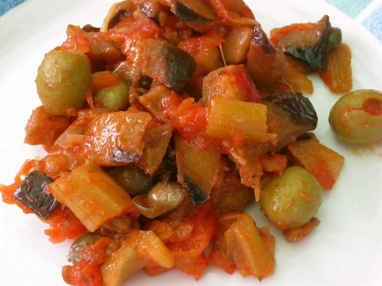 Asciugate le melanzane e mettetele in una padella antiaderente con 4-5 cucchiai di olio insieme ai peperoni e al sedano e fatele friggere finché saranno dorate. A mano a mano che saranno pronte, scolatele su carta assorbente. Nell'olio rimasto nel recipiente appassite la cipolla affettata, unite il passato di pomodoro e, dopo 5 minuti, unite le olive snocciolate, l'aceto, lo zucchero, i pinoli, i capperi, l'uvetta strizzata e le verdure fritte. Salate, pepate e cuocete su fuoco medio per 10 minuti.