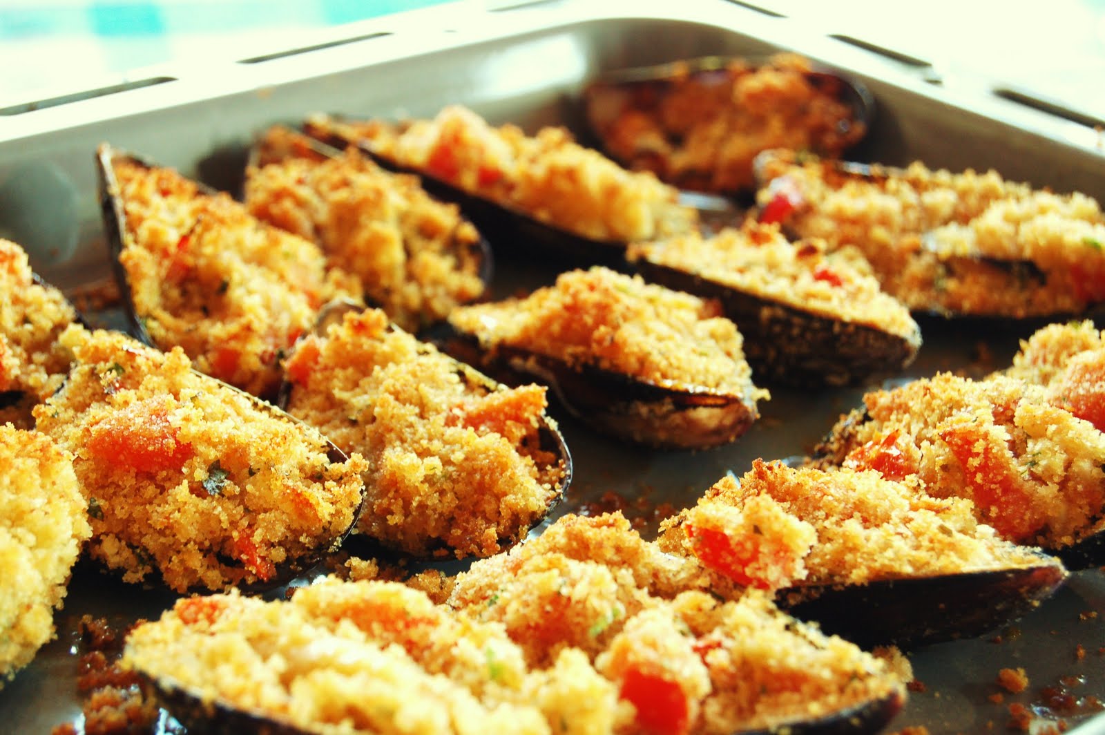 Riempite ciascuna cozza con tale composto, disponetele su una teglia e gratinatele in forno a 240°C per 10 minuti circa.