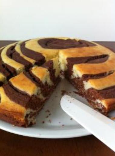 Imburrare e infarinare un teglia e comporre la torta partendo dal centro con una cucchiaiata di impasto bianco e alternare sovrapponendo un’altra dose uguale di impasto al cioccolato, creando una serie di cerchi concentrici fino ad esaurire l’impasto.