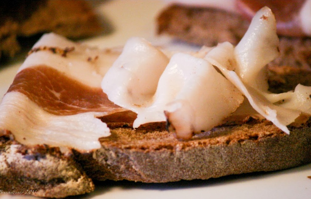 Nel frattempo fate bruscare leggermente il pane da ambo i lati, poi tiratelo fuori dal forno e spruzzatelo con il vino rosso. Aggiungete sopra 1 o 2 fette di guanciale o lardo e spolverizzate con gli aghi di rosmarino precedentemente tritato.