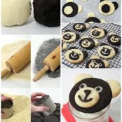 Avvolgere i due impasti nella pellicola trasparente senza pressarli e far riposare in frigo per almeno due ore. Stendere due sfoglie spesse 5 mm col matterello e con l'aiuto di un bicchiere e un tagliapasta di misure diverse per ogni cerchio grande tagliare 3 cerchi piccoli dell'altro colore. Poi assemblare come in figura.