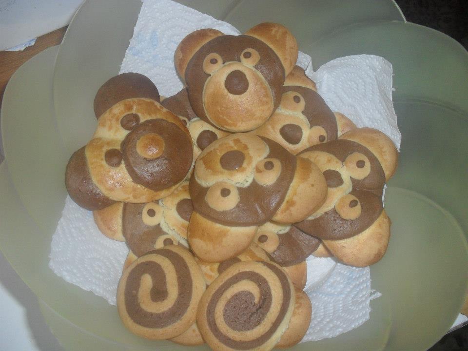 Impastare la margarina morbida con lo zucchero, aggiungere le uova, poi la farina insieme alla vanillina e il lievito tutto una volta. Dividere l'impasto in due parti uguali e in una aggiungere il cacao.