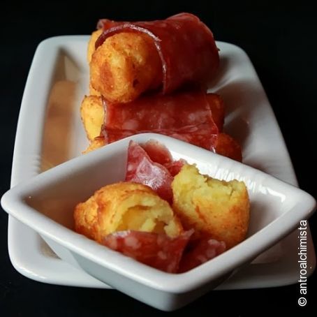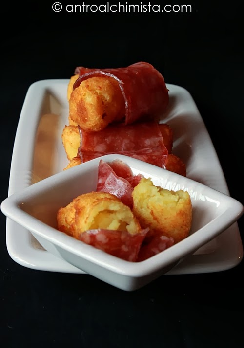 In questa casa non esiste pizza che non sia prima accompagnata da un paio di crocchette di patate. Sono sempre molto gradite da tutti, sono lo stuzzichino immancabile dell’aperitivo del sabato sera. Nella versione presentata oggi le crocchette sono avvolte in una fettina di salame per renderle ancora più gustose.