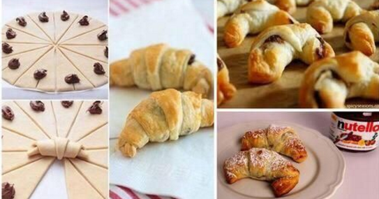 Tagliamo a triangolini la pasta sfoglia, mettiamo un cucchiaino di Nutella o marmellata alla base del triangolino. Arrotoliamo la pasta fino ad ottenere la forma del cornetto.