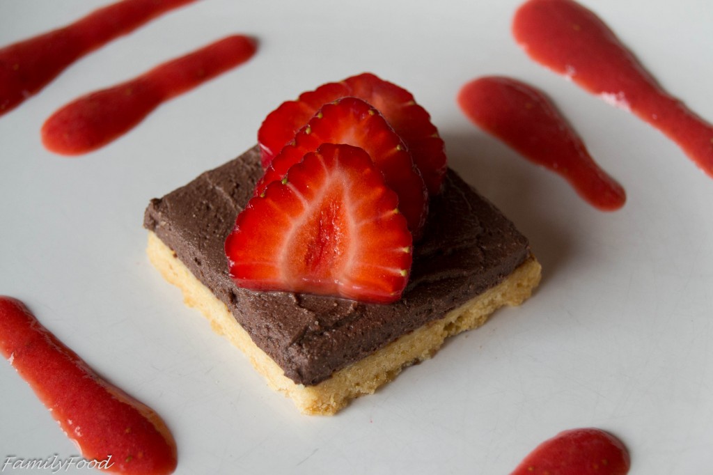 Spalmate uniformemente su tutta la superficie della pasta frolla il composto di ricotta e cioccolato, livellandolo bene. Tagliate ora il quadrato in quadrati più piccoli delle dimensioni che preferite. Guarnite con le fragole e servite i bocconcini con la salsa di fragole.