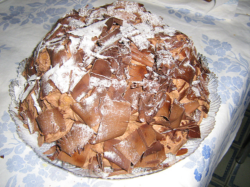 Prima di portare in tavola cospargete di scaglie di cioccolato il bianco e nero e poi spolveratelo di zucchero a velo.