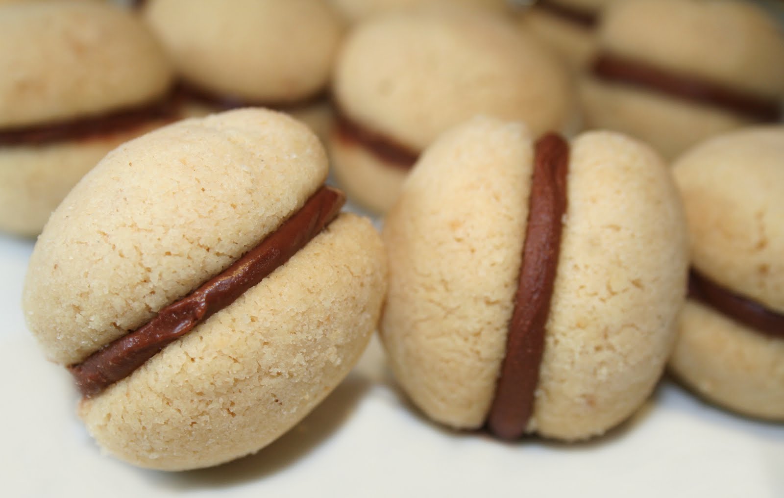 Mettete il cioccolato sciolto sulla parte piatta di una pallina con un cucchiaino, quindi richiudete con un’altra pallina.