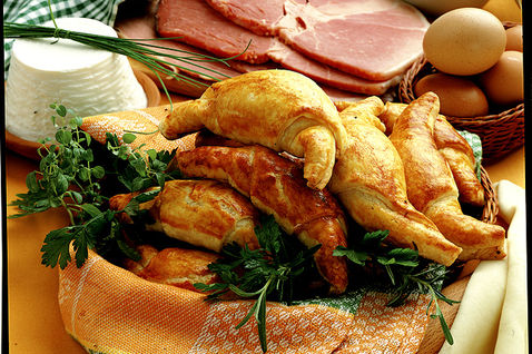 Aggiungete qualche bastoncino di prosciutto, arrotolate i triangoli su se stessi e ripiegate le estremità per formare dei piccoli cornetti; spennellate con 2 tuorli e fate cuocere in forno caldo a 200 ?C per 20 minuti.
