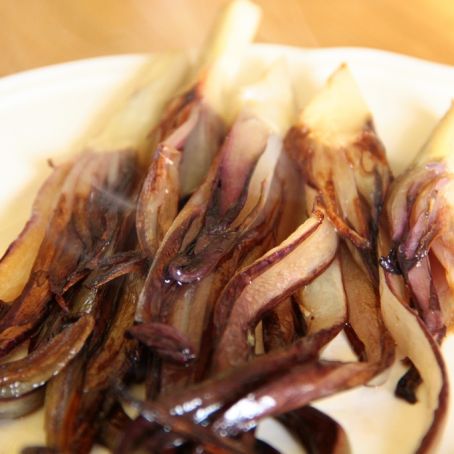 Scaldate una padella con un filo d'olio e disponetevi in modo ordinato i pezzi di radicchio.