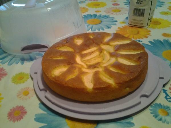 Disporre il composto in una teglia e adagiare sopra delle fettine di male precedentemente tagliate ed infornare a 180° per 30/35 minuti